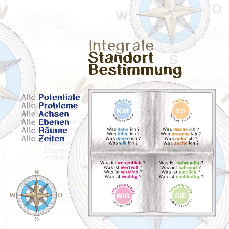 Was es bringt mehr Orientierung & Halt in Zeiten von Wandel & Wirbelstürmen einen umfassenden Überblick aller wesentlichen Lebensbereiche mehr Klarheit über aktuelle Lebensthemen & Entwicklungsfelder erweitertes Bewusstsein, neue Perspektiven, wichtige Einsichten Klärung Erklärung von Lebensbereichen, Lebensthemen & Lebensaufgaben Abklärung von Veränderungswünschen & Wachstumsbedürfnissen Aufklärung über postkonventionelle & spirituelle Entwicklungskrisen Orientierung 3. Person | objektiv | Looking AT | Dimensionen & Räume 2. Person | perspektiv | Looking WITH | Brillen & Filter 1. Person | subjektiv | Looking AS | Identität & Subjekt Alle Zeiten | Vergangenheit | Gegenwart | Zukunft | Jetzt |